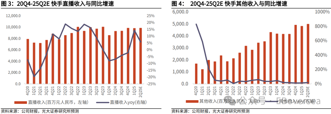 我们预计25Q2快手DAU达4.09亿(yoy+3.5%),MAU为7.1亿(yoy+3.2%),DAU/MAU为57.2%;每DAU日均使用时长123.8分钟(yoy+1.5%)。